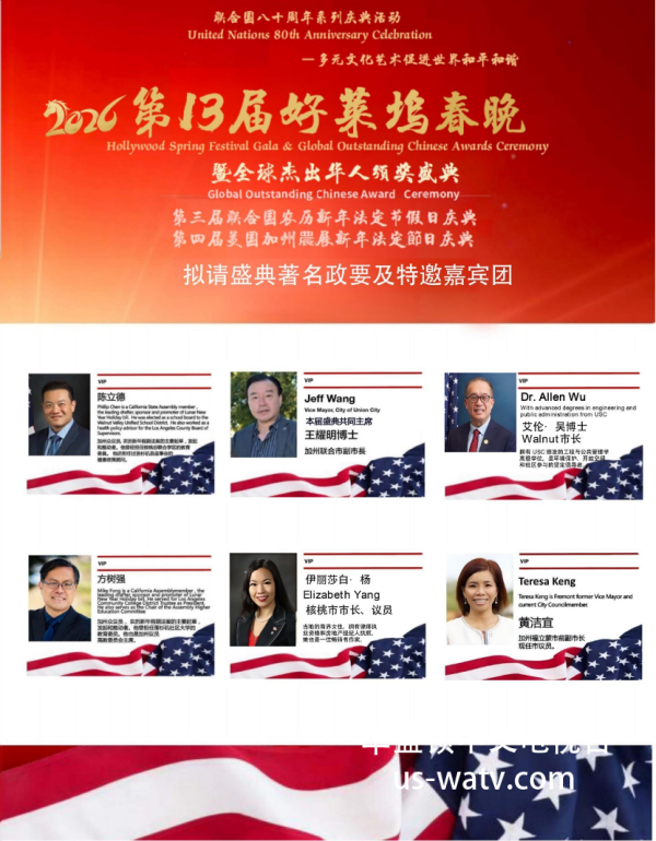 - 加州联合市副市长、加州政府绿色与环境治理委员会副主席、联合国80周年庆典活动组委会共同主席 Jeff Wang(王耀明博士) 代表主席团致辞,高度评价好莱坞春晚十三年来在促进中美民间友好、多元文化交流及公益事业方面的积极贡献。